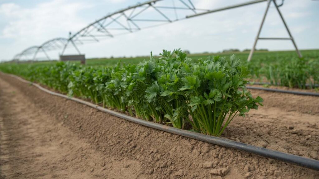 La gestión del riego es crucial. El apio necesita un suministro de agua constante y regular, ya que no tolera bien los suelos secos. La implementación de un riego por goteo resulta efectiva para asegurar que las raíces obtengan la humedad adecuada sin encharcamientos. Este método optimiza el uso del agua y permite un crecimiento más uniforme.